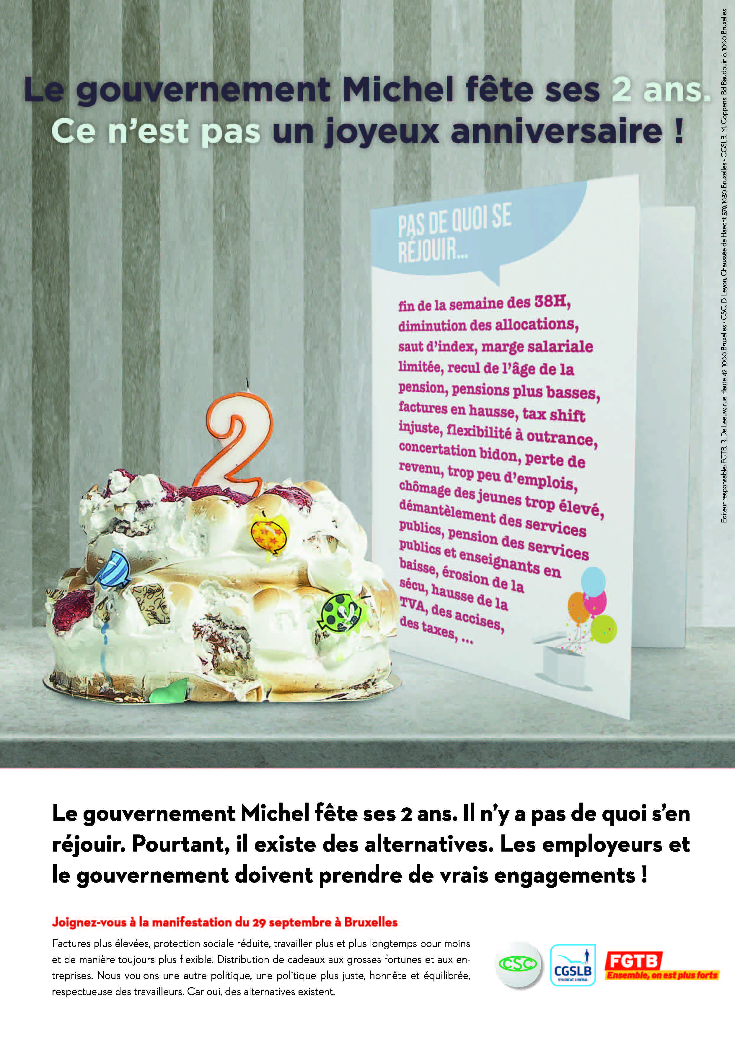 Le gouvernement Michel fête ses 2 ans et il n’y a vraiment pas de quoi s’en réjouir. Factures plus élevées, protection sociale réduite, travailler plus et plus longtemps pour moins et de manière toujours plus flexible. Distribution de cadeaux aux grosses fortunes et aux entreprises. Nous voulons une autre politique, une politique plus juste, honnête et équilibrée, respectueuse des travailleurs.