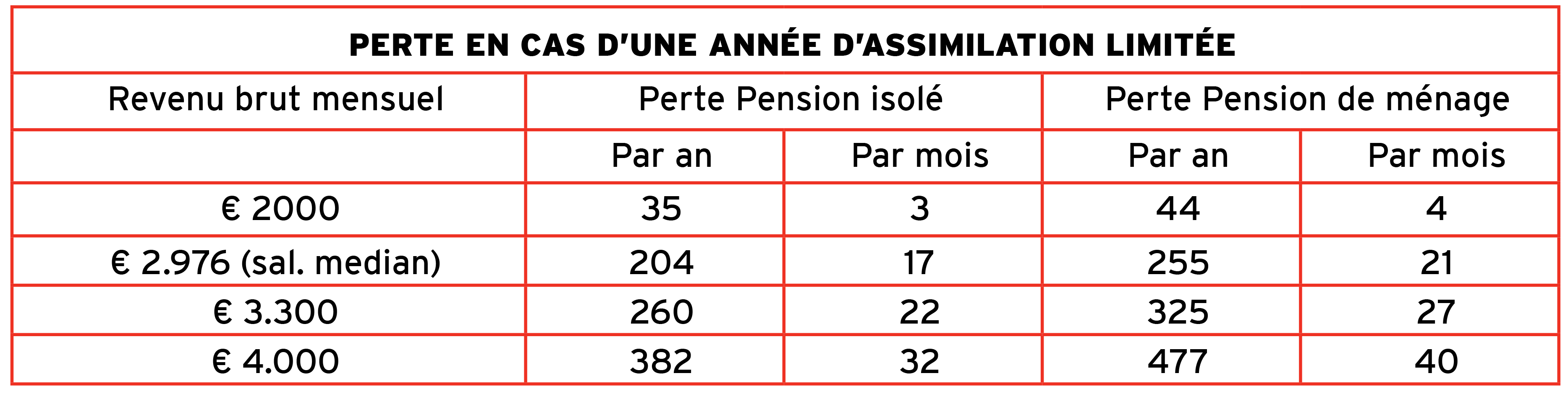 - Les femmes sont également lourdement touchées par ces mesures : le travail à temps partiel avec maintien des droits (nettoyage, commerce, aides familiales, titres services, ALE…) est directement concerné. Avec une durée de carrière moyenne plus courte, les femmes touchent en moyenne des pensions plus basses, sur lesquelles la limitation des périodes assimilées auront un impact très lourd !