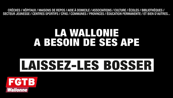 * Les APE (Aides à la Promotion de l’Emploi) sont des subventions publiques destinées à soutenir l’emploi dans le secteur non marchand, les pouvoirs locaux et l’enseignement. Elles permettent de financer, totalement ou en partie, 60.000 emplois en Wallonie et à Bruxelles.