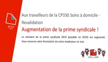Aux travailleurs de la CP330 Soins à domicile – Revalidation Augmentation de la prime syndicale ! Le montant de la prime syndicale 2019 (payable en 2019) est augmenté. Vous recevrez votre formulaire via votre employeur en mai. Quels sont les nouveaux montants applicables pour la prime 2019 ? – € 100 pour les affilié·e·s payant…