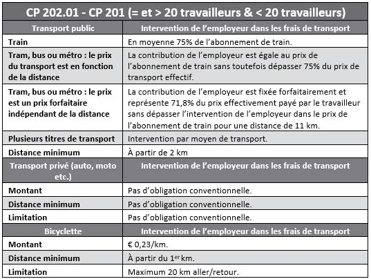 Dans le secteur du commerce une intervention de l’employeur est également prévue pour les travailleurs effectuant le chemin du travail à bicyclette et dans les commissions paritaires 202, 311, 312 pour les déplacements avec un moyen de transport privé (véhicule propre par exemple).