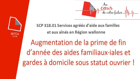 Après l’augmentation de la prime syndicale, ce 23 septembre 2019, les interlocuteurs sociaux ont signé les conventions collectives de travail pour augmenter la prime de fin d’année! Considérée comme un salaire, la prime de fin d’année est soumise au paiement de cotisations ONSS (par votre employeur et par vousmêmes) et au précompte professionnel. la prime de fin d’année résulte d’une convention collective conclue dans certains secteurs. Une convention collective de travail spécifique a été signée pour les aides familiales et les gardes à domicile, car comme vous le savez déjà, ils·elles passeront prochainement sous Région wallonne! Nous attendons de rencontrer la nouvelle Ministre de l’action sociale pour concrétiser cela rapidement.