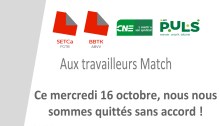 Aux travailleurs Match Ce mercredi 16 octobre, nous nous sommes quittés sans accord ! Force est de constater que le fossé reste très profond entre la direction et les syndicats. Non seulement, nos avis divergent drastiquement par rapport au montant des indemnités financières mais, plus fondamentalement, la direction suit une philosophie qui lui est tout…