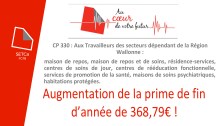 Aux Travailleurs des secteurs dépendant de la Région Wallonne: maison de repos, maison de repos et de soins, résidence-services, centres de soins de jour, centres de rééducation fonctionnelle, services de promotion de la santé, maisons de soins psychiatriques, habitations protégées. Augmentation de la prime de fin d’année de 368,79€ ! Enfin la concrétisation complète de…
