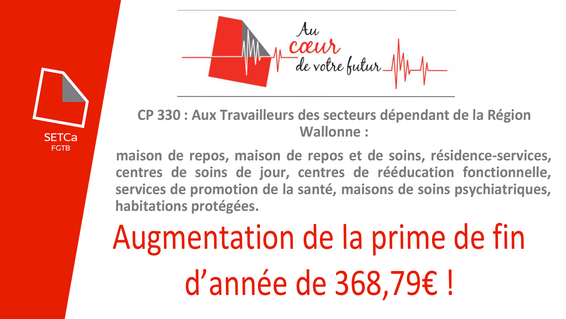 Aux Travailleurs des secteurs dépendant de la Région Wallonne: maison de repos, maison de repos et de soins, résidence-services, centres de soins de jour, centres de rééducation fonctionnelle, services de promotion de la santé, maisons de soins psychiatriques, habitations protégées.