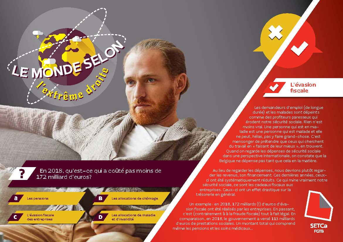 Un exemple : en 2018, 172 milliards (!) d’euros d’évasion fiscale ont été réalisés par les entreprises. En passant, c’est (contrairement à à la fraude fiscale) tout à fait légal. En comparaison, en 2018, le gouvernement a versé 113 milliards d’euros de prestations sociales. Un montant total qui comprend même les pensions et les soins médicaux…