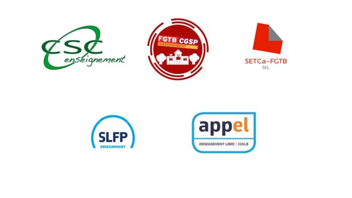 Roland LAHAYE, CSC-Enseignement / Joseph THONON, CGSP-Enseignement / Joan LISMONT, SEL-SETCa / Masanka TSHIMANGA, SLFP-Enseignement /Marc MANSIS, CGSLB-Appel