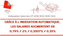 Indexation dans les CP 209 / 303 / 309 / 310 GRÂCE À L’INDEXATION AUTOMATIQUE, LES SALAIRES AUGMENTENT DE 0,79% – 2% – 0,3507% – 0,35% Les prix dans les magasins augmentent, votre salaire aussi. C’est ce que l’on appelle l’indexation automatique. L’indexation automatique des salaires et des allocations sociales permet de protéger votre pouvoir…
