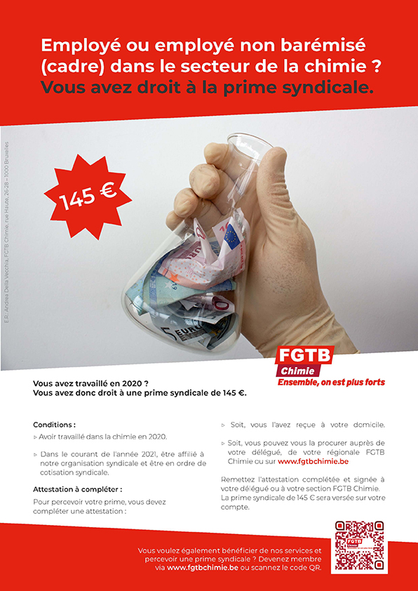 Vous voulez également bénéficier de nos services et percevoir une prime syndicale ? Devenez membre via http://www.fgtbchimie.be ou scannez le code QR.