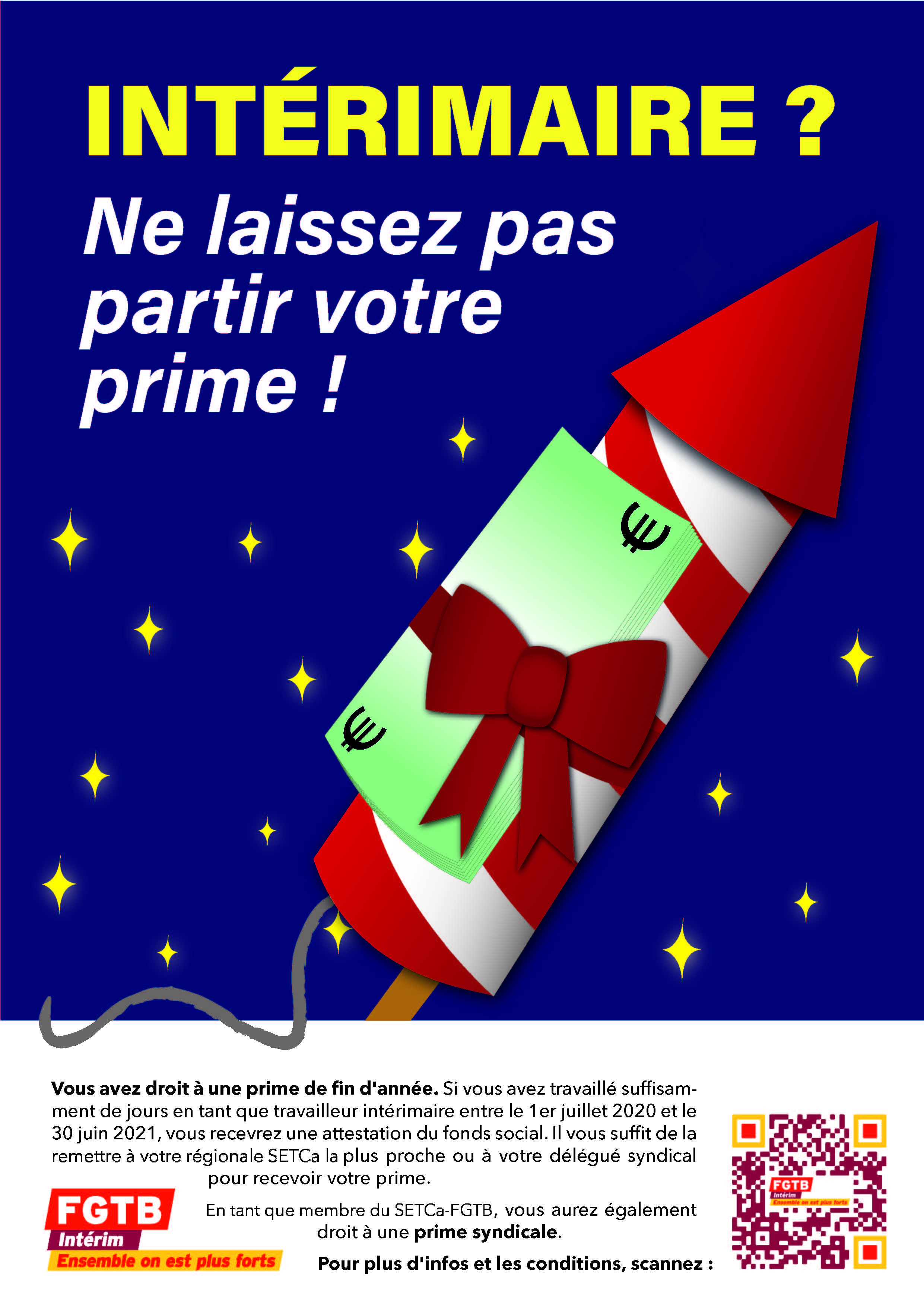 Vous avez droit à une prime de fin d’année. Si vous avez travaillé suffisamment de jours en tant que travailleur intérimaire entre le 1er juillet 2020 et le 30 juin 2021, vous recevrez une attestation du fonds social. Il vous suffit de la remettre à votre bureau FGTB le plus proche ou à votre délégué syndical pour recevoir votre prime.