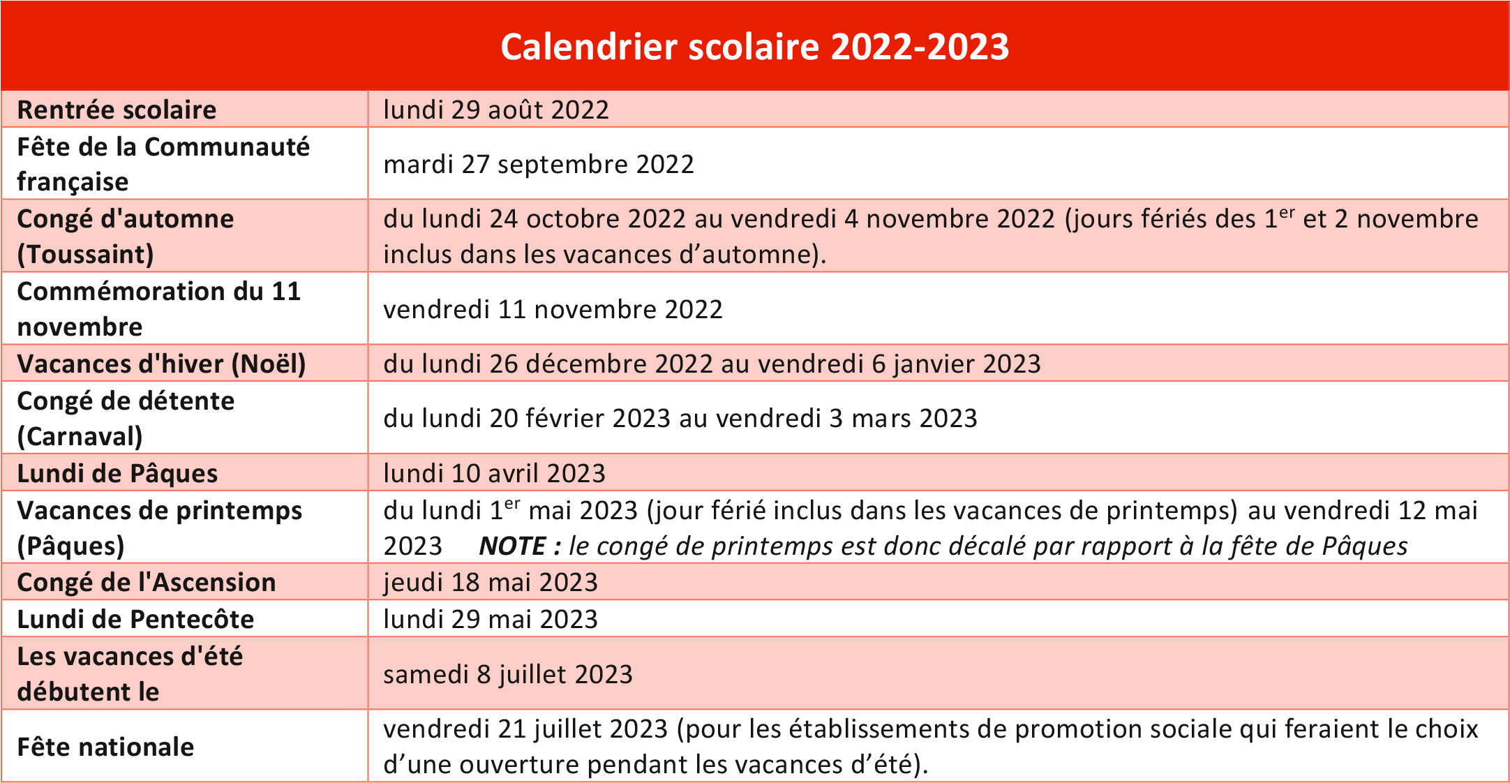 Le calendrier scolaire est disponible et téléchargeable sur http://www.enseignement.be/index.php?page=23953