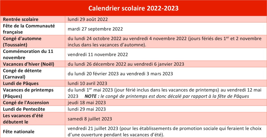 Un arrêté sera pris annuellement au mois d’avril afin de fixer les dates des vacances d’été à X+2. Les dates mentionnées ici pour 2022-2023 seront confirmées par AGCF.