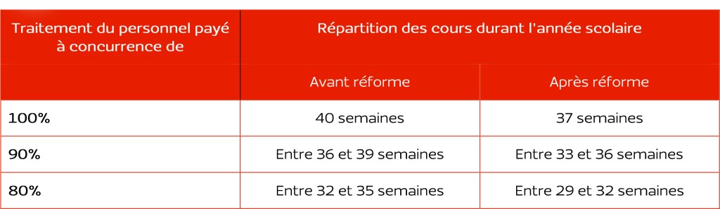 La modification du temps scolaire dans le calendrier civil a pour conséquence d’étendre la période de prestation des membres du personnel. Ce ne sont plus 300 à 303 jours qui séparent le début et la fin de l’année scolaire, mais désormais 313 jours exactement.