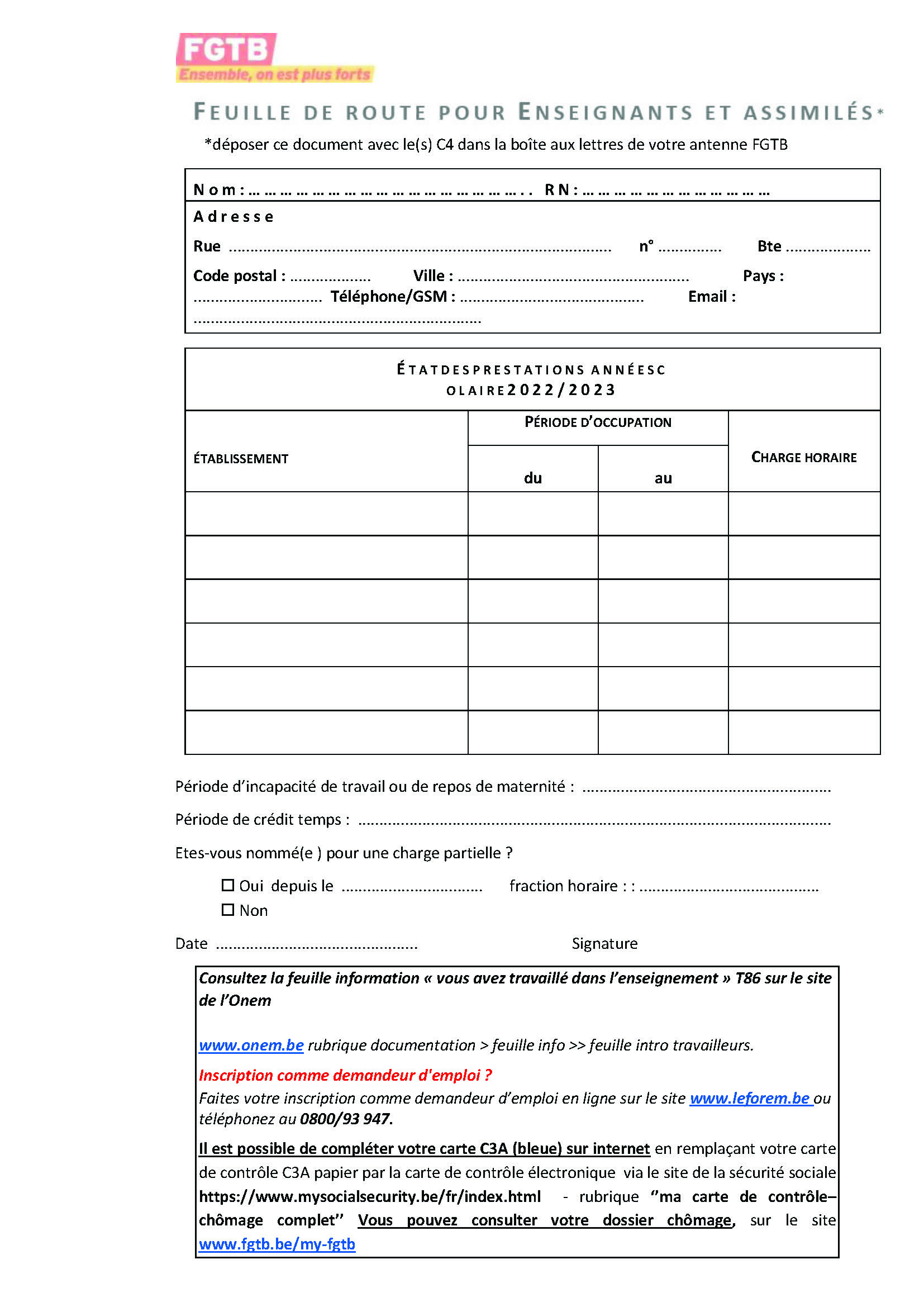 - Si vous êtes désigné pour la nouvelle année scolaire avec un horaire incomplet : Prenez contact avec le service chômage de la FGTB.