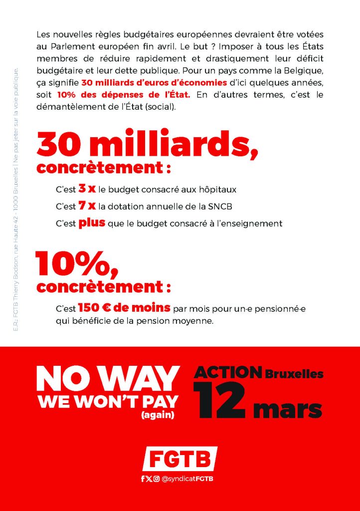 La FGTB organise une action le mardi 12 mars 2024 afin de protester contre les nouvelles mesures budgétaires décidées par l’Europe.
