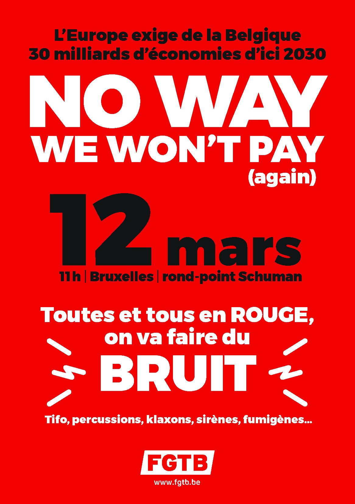 La FGTB organise une action le mardi 12 mars 2024 afin de protester contre les nouvelles mesures budgétaires décidées par l’Europe.