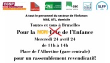 A tout le personnel du secteur de l’Enfance: MAE, ATL, domicile Toutes et tous à BruxellesPour la NON-Fête de l’Enfance Mercredi 24 avril 2024 de 11h à 14hPlace de l’Albertine (gare centrale)pour un rassemblement revendicatif!