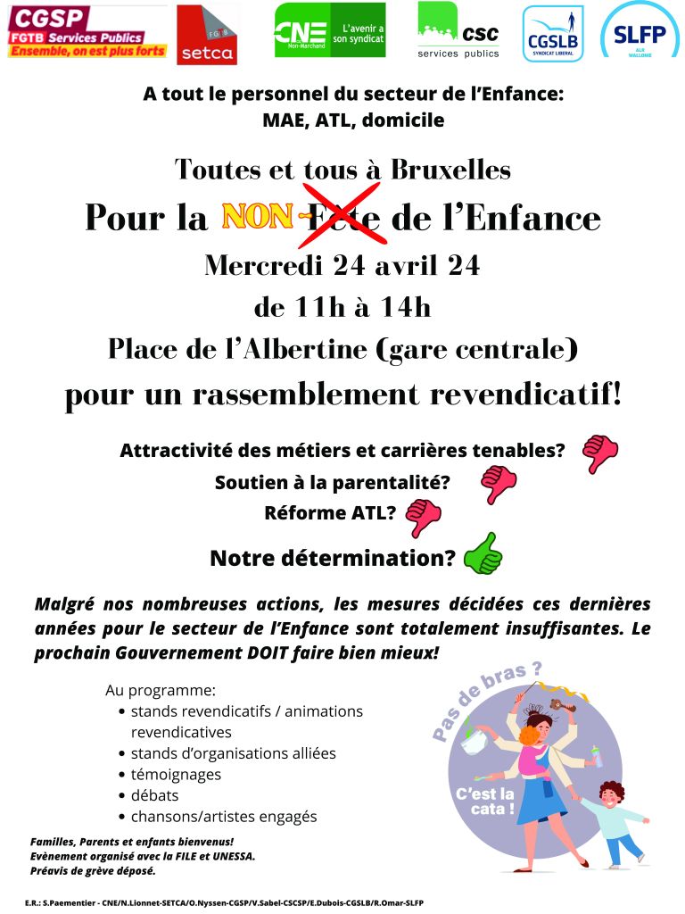 Non-Fête de l’Enfance maisondesemployes2014 / 17 avril 2024 A tout le personnel du secteur de l’Enfance: MAE, ATL, domicile Toutes et tous à BruxellesPour la NON-Fête de l’Enfance Mercredi 24 avril 2024 de 11h à 14hPlace de l’Albertine (gare centrale)pour un rassemblement revendicatif! Partager : Cliquer pour partager sur X(ouvre dans une nouvelle fenêtre) X Cliquez pour partager sur Facebook(ouvre dans une nouvelle fenêtre) Facebook J’aime chargement…