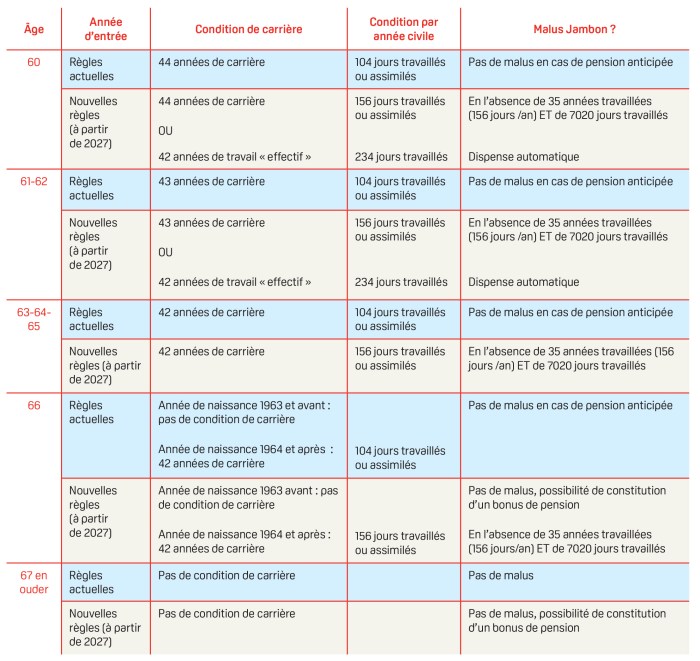 Le tableau ci-dessous présente les différences entre les règles actuelles et futures pour la pension anticipée. Attention, alors que les règles relatives à la pension anticipée n’entreront en vigueur qu’en 2027, le malus Jambon entrera déjà en vigueur en janvier 2026 !