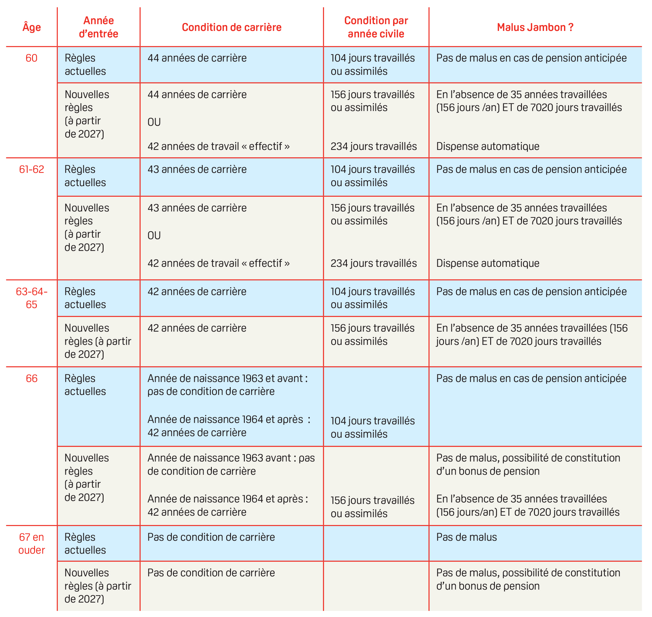Le tableau ci-dessous présente les différences entre les règles actuelles et futures pour la pension anticipée. Attention, alors que les règles relatives à la pension anticipée n’entreront en vigueur qu’en 2027, le malus Jambon entrera déjà en vigueur en janvier 2026 !