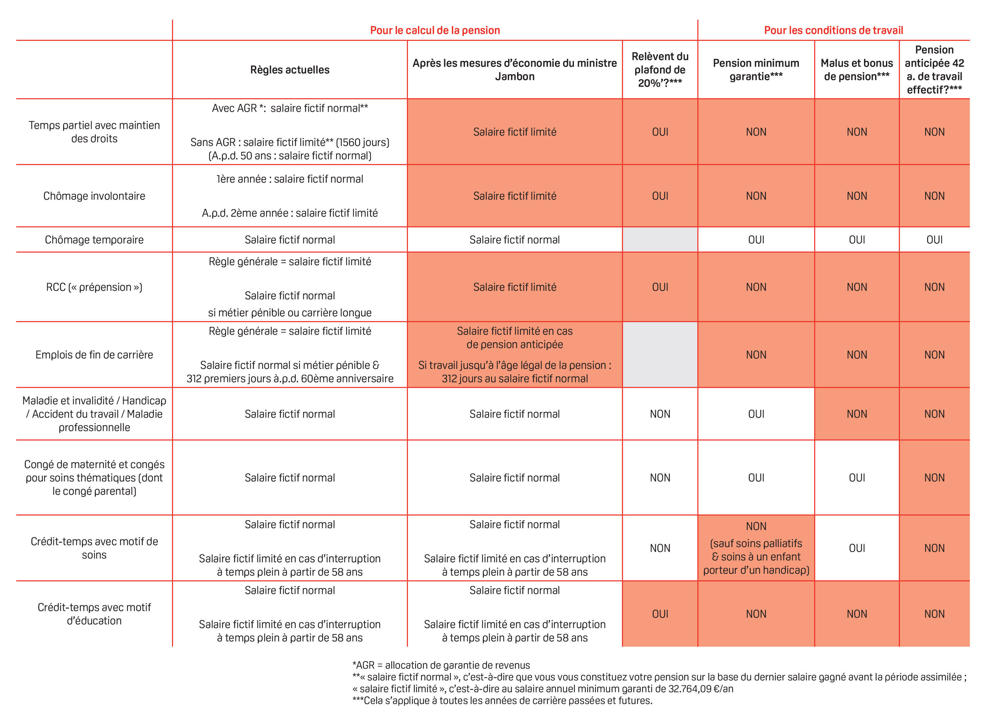 Les mesures d’économie du ministre Jambon rabotent fortement les périodes assimilées. Les plans du ministre les impactent quasiment toutes. Le tableau ci-dessous reprend, en rouge, les mesures d’économies en question. Seule l’assimilation pour chômage temporaire semble pour le moment préservée.