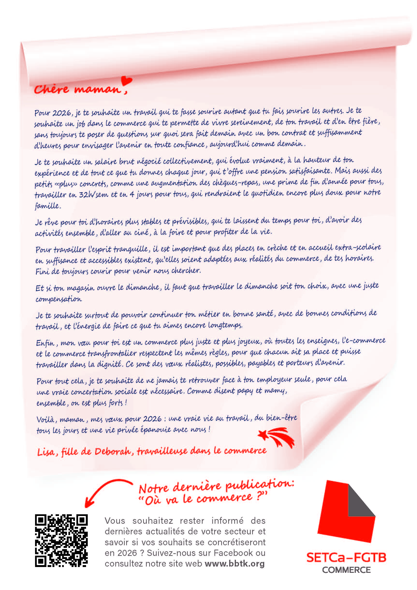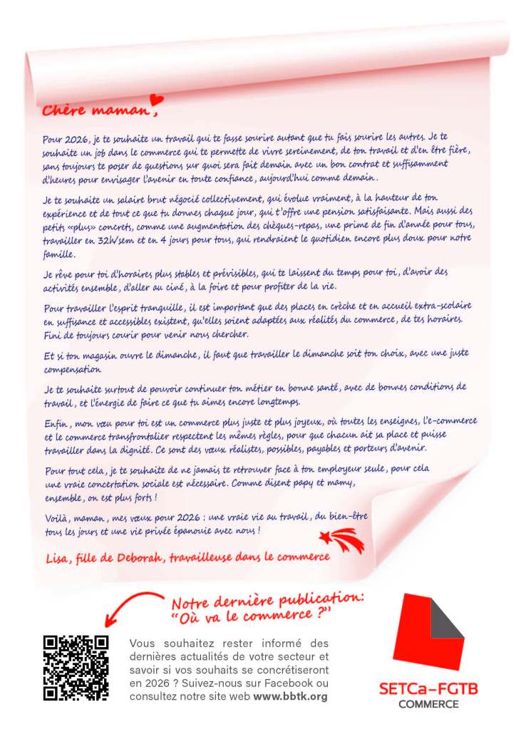 Pour 2026, je te souhaite un travail qui te fasse sourire autant que tu fais sourire les autres. Je te souhaite un job dans le commerce qui te permette de vivre sereinement, de ton travail et d’en être fière, sans toujours te poser de questions sur quoi sera fait demain avec un bon contrat et suffisamment d’heures pour envisager l’avenir en toute confiance, aujourd’hui comme demain.