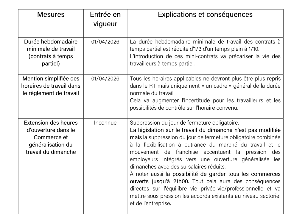 Le gouvernement Arizona a établi toute une série de mesures qui vont précariser et flexibiliser durablement le monde du travail et le secteur du Commerce en particulier. Il reste de nombreuses incertitudes sur les modalités d’application de ces mesures et sur leurs dates d’entrée en vigueur. Voici un état des lieux succinct des principales mesures qui vont impacter le Commerce.