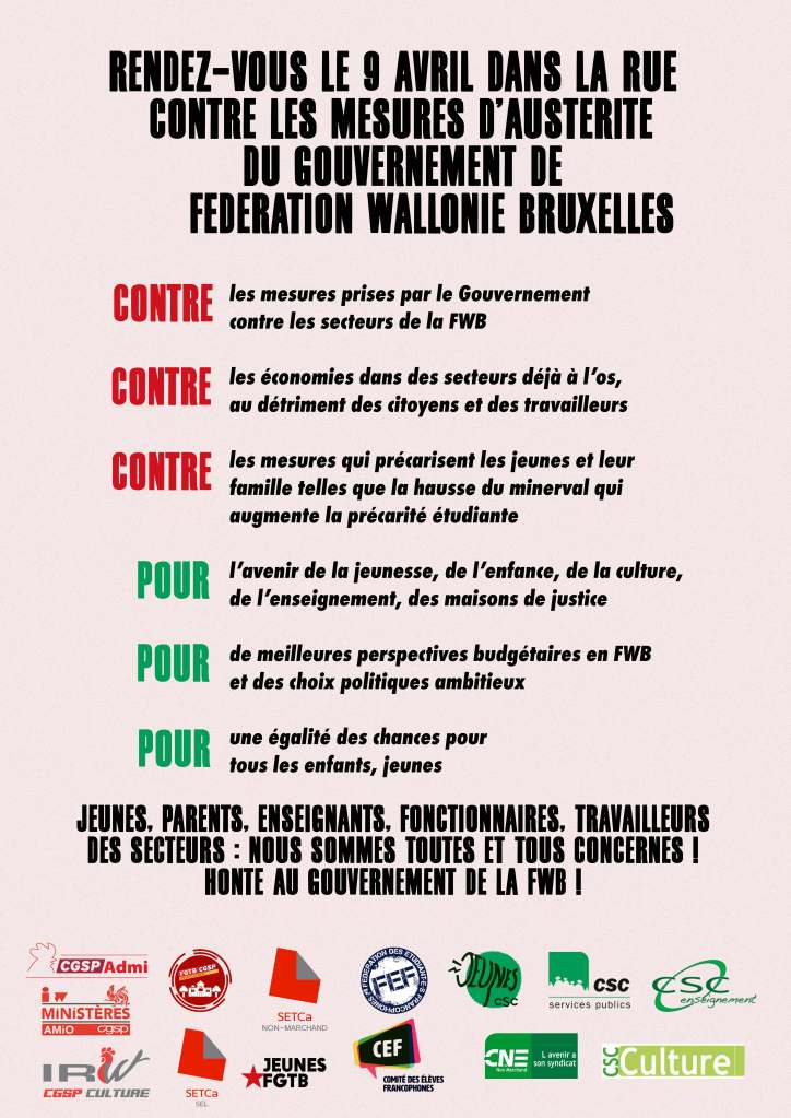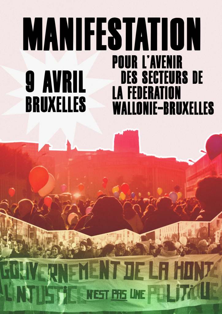 Manifestation le 9 avril 2026 maisondesemployes2014 / Il y a 2 heures 17 mars 2026 RENDEZ-VOUS LE 9 AVRIL DANS LA RUE CONTRE LES MESURES D’AUSTÉRITÉ DU GOUVERNEMENT DE FÉDÉRATION WALLONIE BRUXELLES Partager : Partager sur X(ouvre dans une nouvelle fenêtre) X Partager sur Facebook(ouvre dans une nouvelle fenêtre) Facebook J’aime chargement…