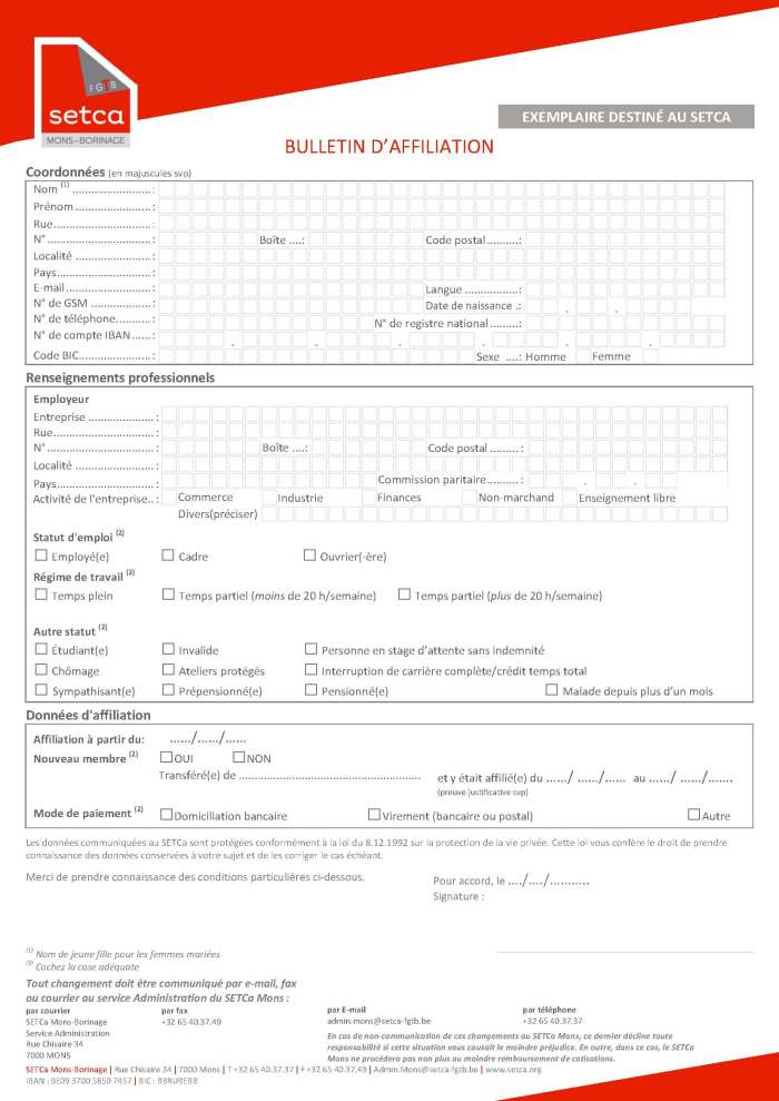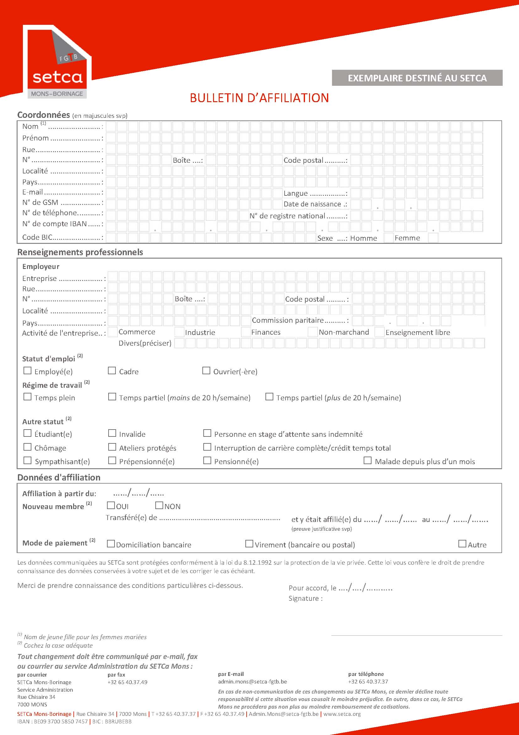 - Téléchargez, remplissez et renvoyez-nous le bulletin d’affiliation ( admin.mons@setca-fgtb.be )